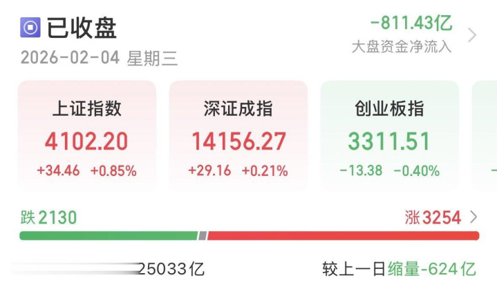 2月4日,A股三大指数涨跌不一。截至收盘,沪指涨0.85%,收复“4100点”失地,收报4102.20点;深证成指涨0.21%,收报14156.27点;创业板指探底回升,盘中跌幅一度达到2.41%,最终小幅收跌0.4%,收报3311.51点。全市场全天成交额达到2.5万亿元,较昨日小幅缩量624亿元。全市场超3200只个股上涨,2130只个股下跌。